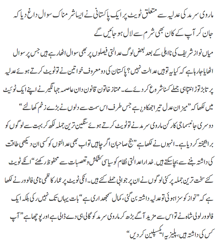pakistanPolitics Marvi Sarmad Adlia Mukhalif Tweet On نومبر 9, 2017 جج صاحبان اگر چاہیں تو اب بھی عدالتوں کو کسی ان دیکھی طاقت کی داشتہ بننے سے بچا سکتے ہیں. خدارا عدالتی نظام کو سیاسی کشمکش و تعصبات سے محفوظ رکھئے. — Marvi Sirmed (@marvisirmed) November 8, 2017 Share FacebookTwitterWhatsAppEmail